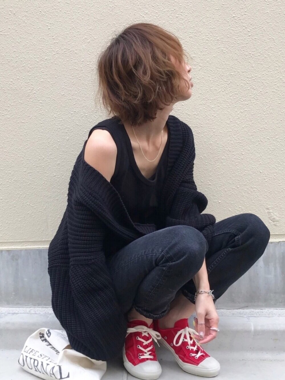 ブラックに赤❤️ 春夏のゆるいブラックコーデ好きやなー☺️✨ アゼニットカーデがこの時期めちゃ使いやすい👌💕 インスタ kumika_iiio2