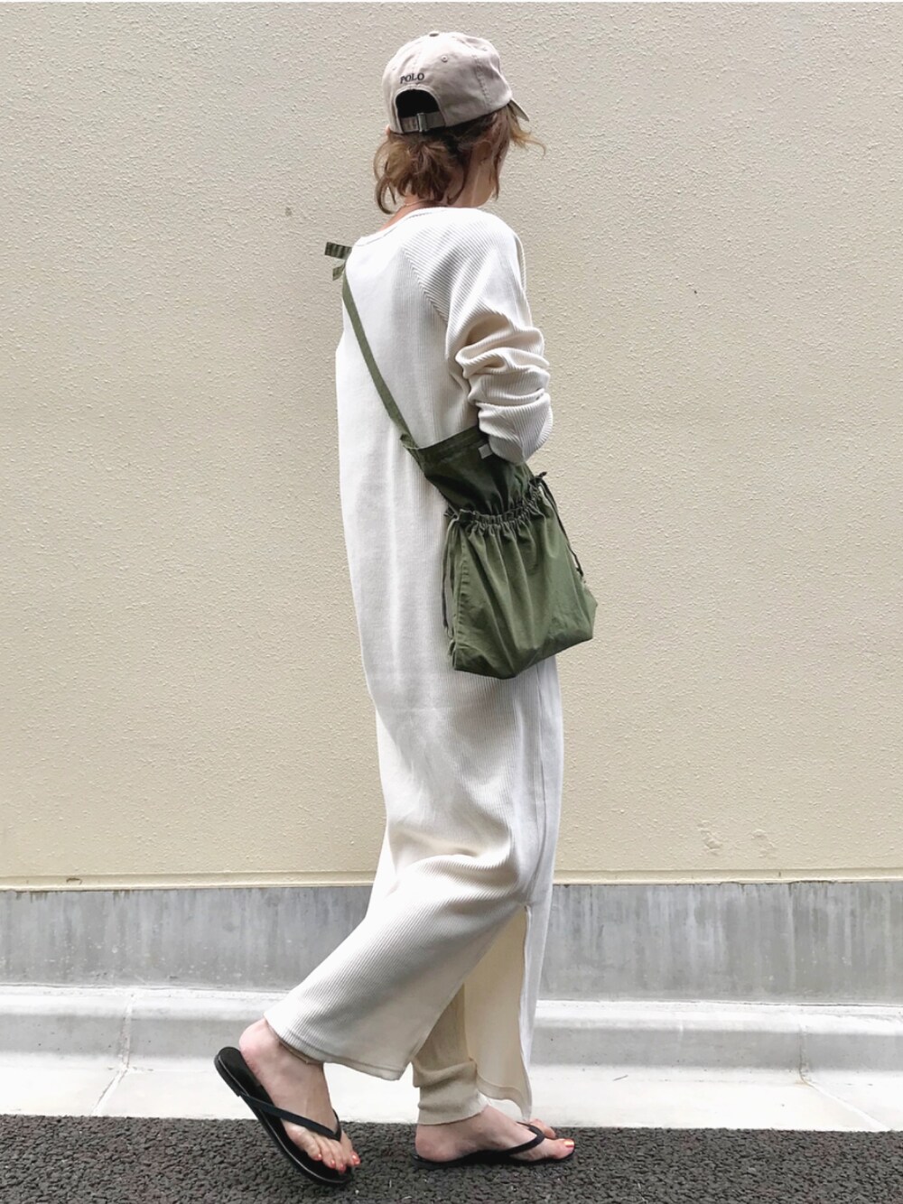 ワンピにレギンスにキャップ🧢 アイボリーワントーンに、差し色カーキ🌿 このラグランワンピ、めちゃくちゃ可愛い😭❤️❤️ インスタ @kumika_iiio2