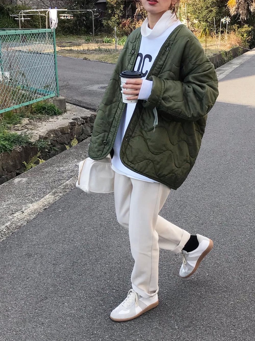 インナーはオールホワイトやけど、靴下は黒🧦 よく着てるスウェットと、このホワイトのパンツもあったかいし形がきれいでどっちもお気に入り💕 インスタ @kumika_iiio2