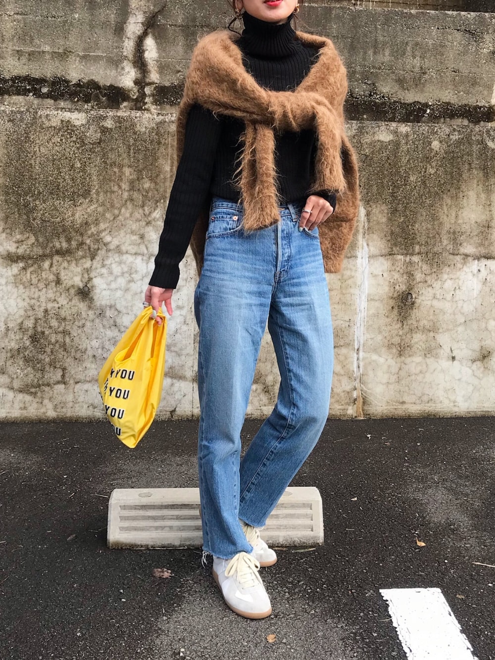 シンプルコーデにモケモケニット肩掛け🧶 イエローのミニショッパーbagが差し色になって可愛い☺️ インスタ @kumika_iiio2