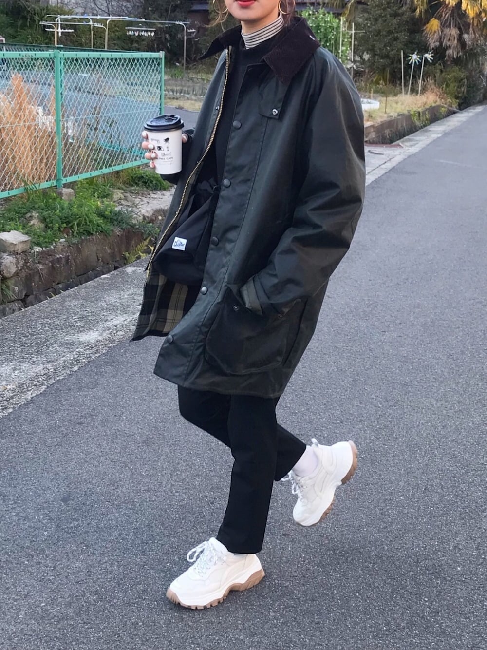 アウターあり。 barbourにダッドスニーカー👟 barbourのオイルジャケットは、旦那さんと兼用で着れるオーバーサイズにしました。 女子がダボっと着ても可愛い♡ インスタ @kumika_iiio2