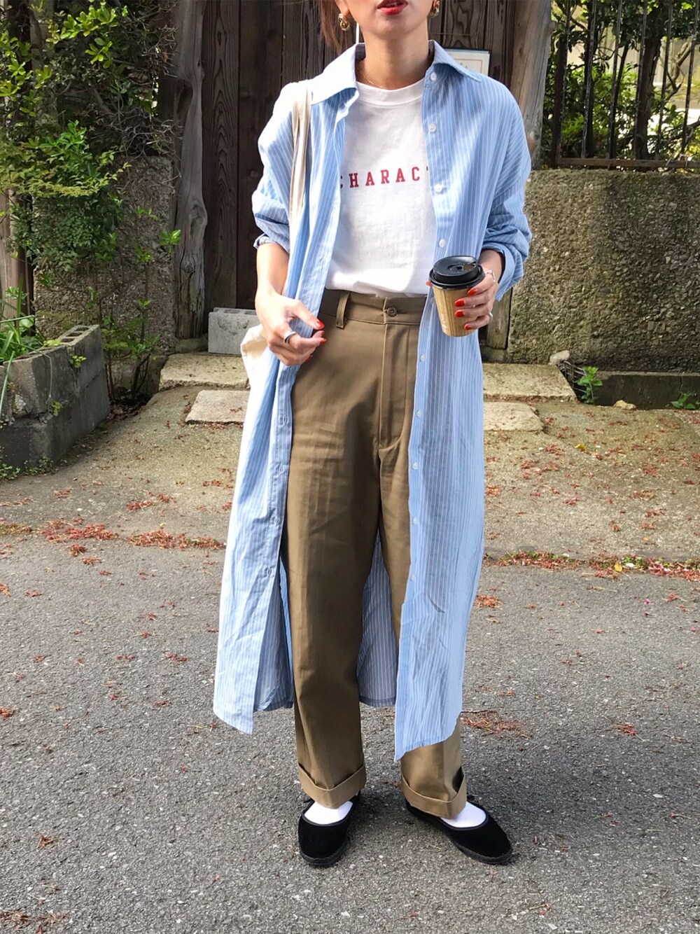 水色、チノ、赤字ロゴ🌸 水色のストライプシャツを羽織りとして☺️ インスタ @kumika_iiio2