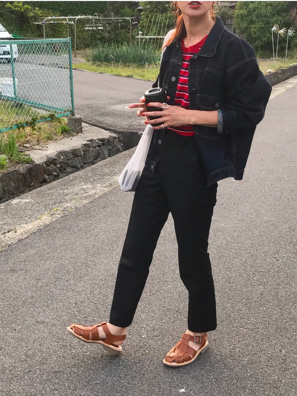 赤ボーダーのタンクと、デニムジャケットと、グルカサンダル🌸 インスタ @kumika_iiio2