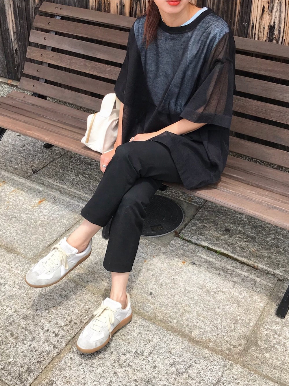 ブラックコーデにブルーちらり☺️ roku のスケスケなオーバーサイズtシャツ♡ インナーは、hanesbiotopのブルー💙 インスタ @kumika_iiio2