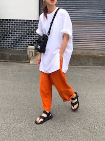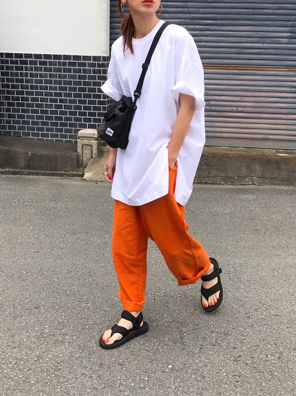 ゆるっとオレンジコーデ🍊 雨降ってきたから、パンツはロールアップで☺️ インスタ @kumika_iiio2