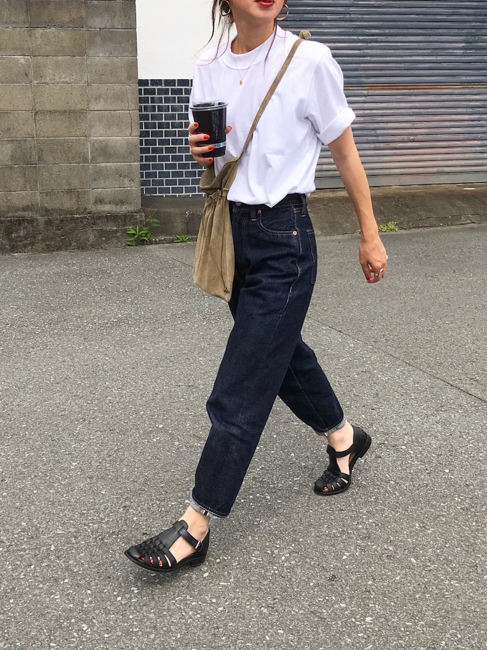 定番デニム×白t 足元はレザーメッシュのサンダルでちょっと女子感☺️🌸 インスタ @kumika_iiio2