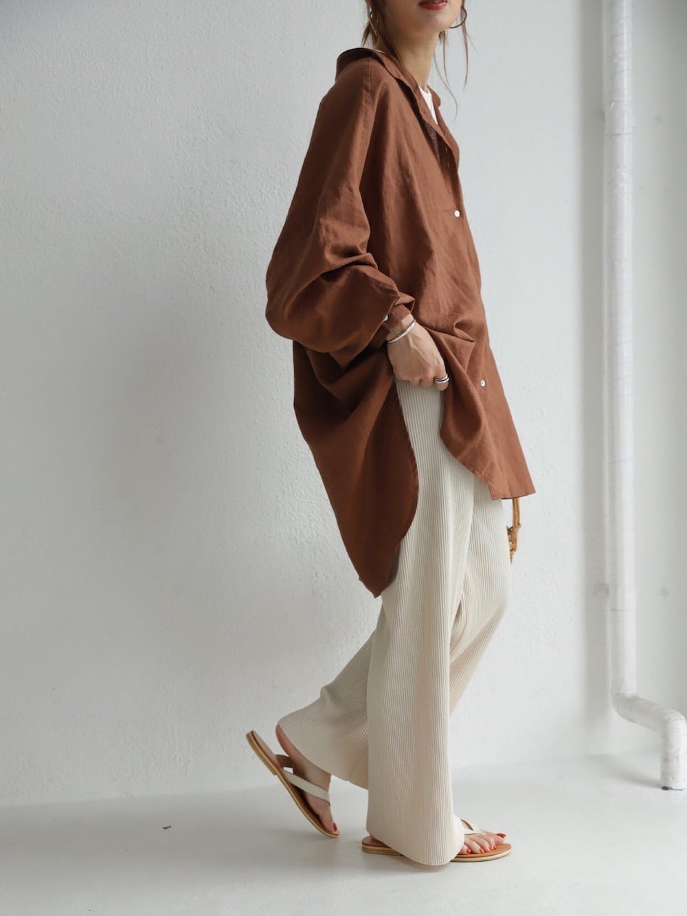 ベージュとブラウンのゆるコーデ♡ antiqua×kumika コラボのスタンドカラーシャツ。 ブラウンもおススメです☺️ 色んなボトムスに合うサイズ感で作ってます🙆♀️ インスタ @kumika_iiio2