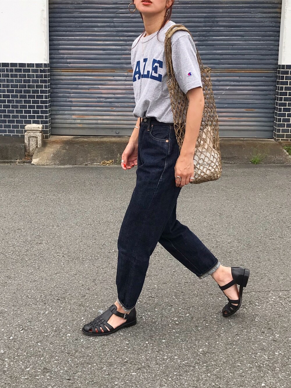 カレッジt着まわし♡ カジュアルに足元レザーメッシュのサンダル インスタ @kumika_iiio2