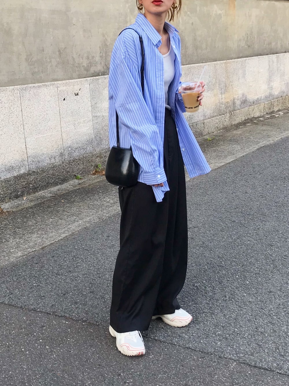 シンプルコーデに、ブルーのストライプシャツ🌸 足元はボリュームのあるasicsスニーカー👟❤️ インスタ @kumika_iiio2