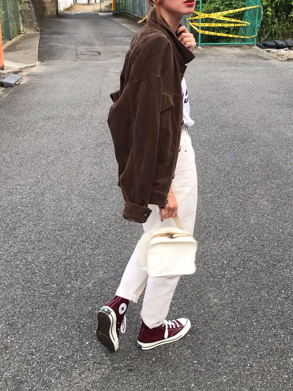 ホワイトコーデにブラウンのコーデュロイジャケット🍂 インスタ @kumika_iiio2
