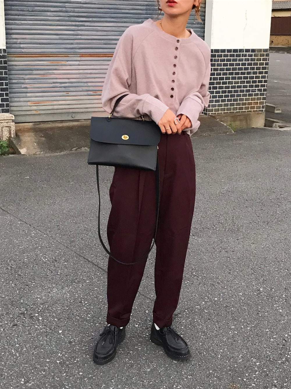 ボタンいっぱいなヘンリーネックと、バーガンディのuniqlo ウールブレンドパンツ👖 インスタ @kumika_iiio2