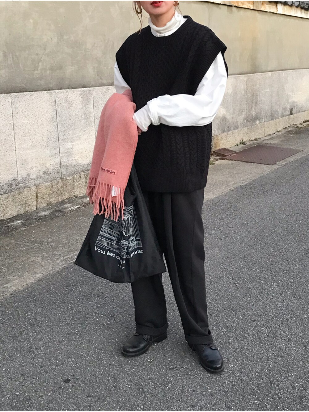 モノトーンにマフラーピンクで差し色🧣 インスタ @kumika_iiio2