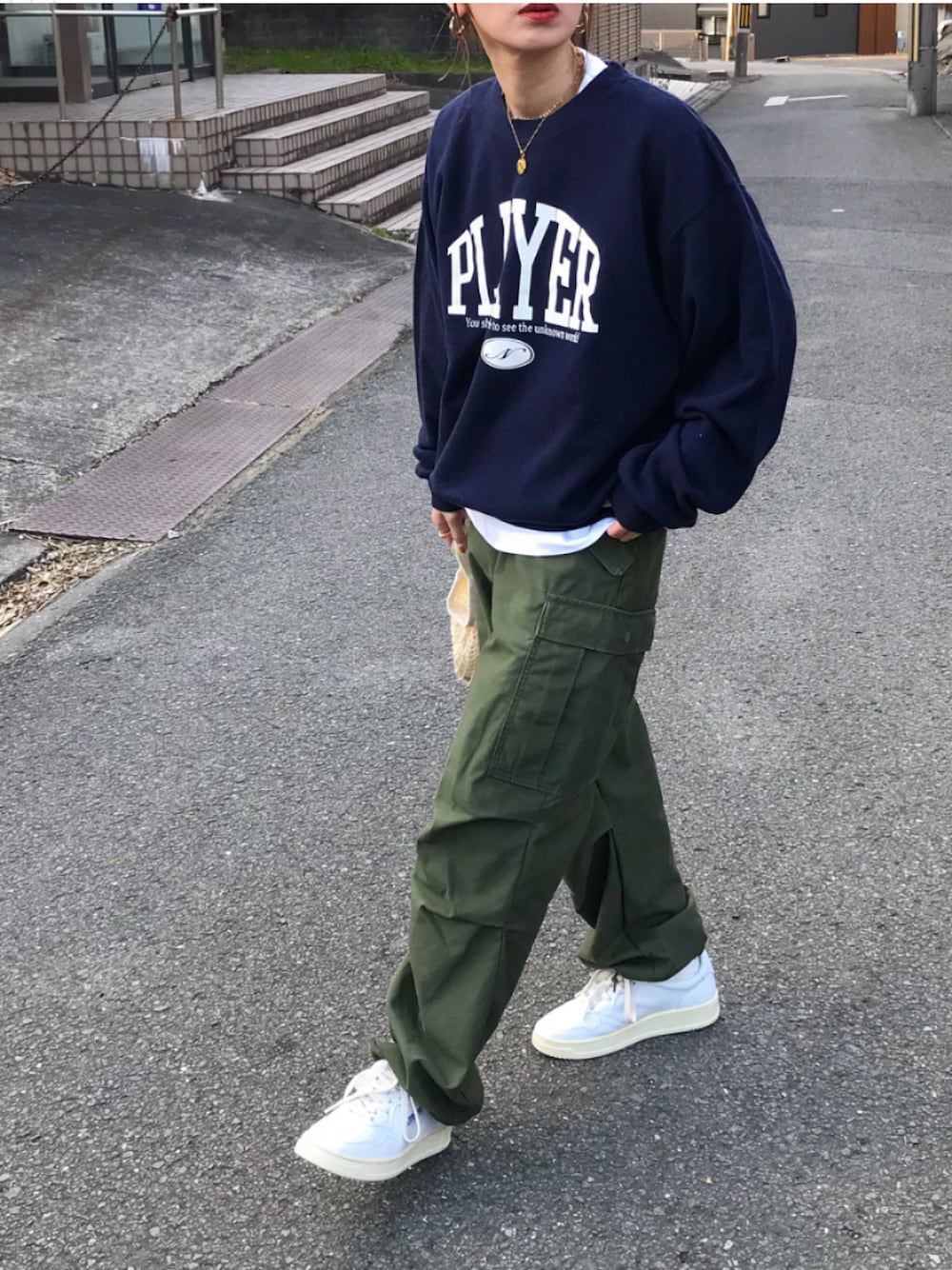 古着のM-65パンツに、ネイビースウェット♡ インスタ @kumika_iiio2