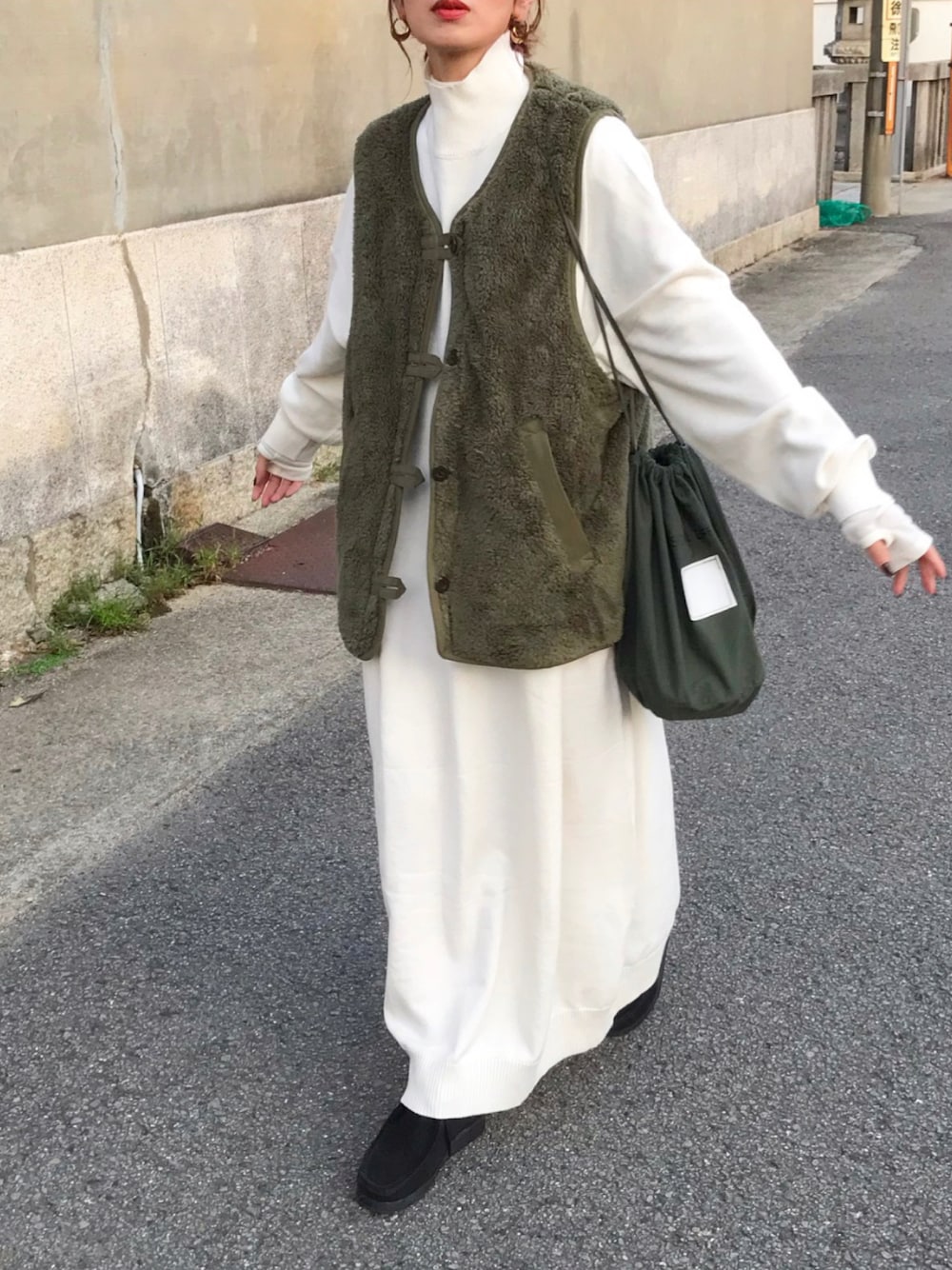 ゆるっとアイボリーのニットワンピ💓 ミリタリー なボアベスト合わせ。 hanne and kumika 発売開始✨ 本日1000円クーポン出てます✨ インスタ @kumika_iiio2