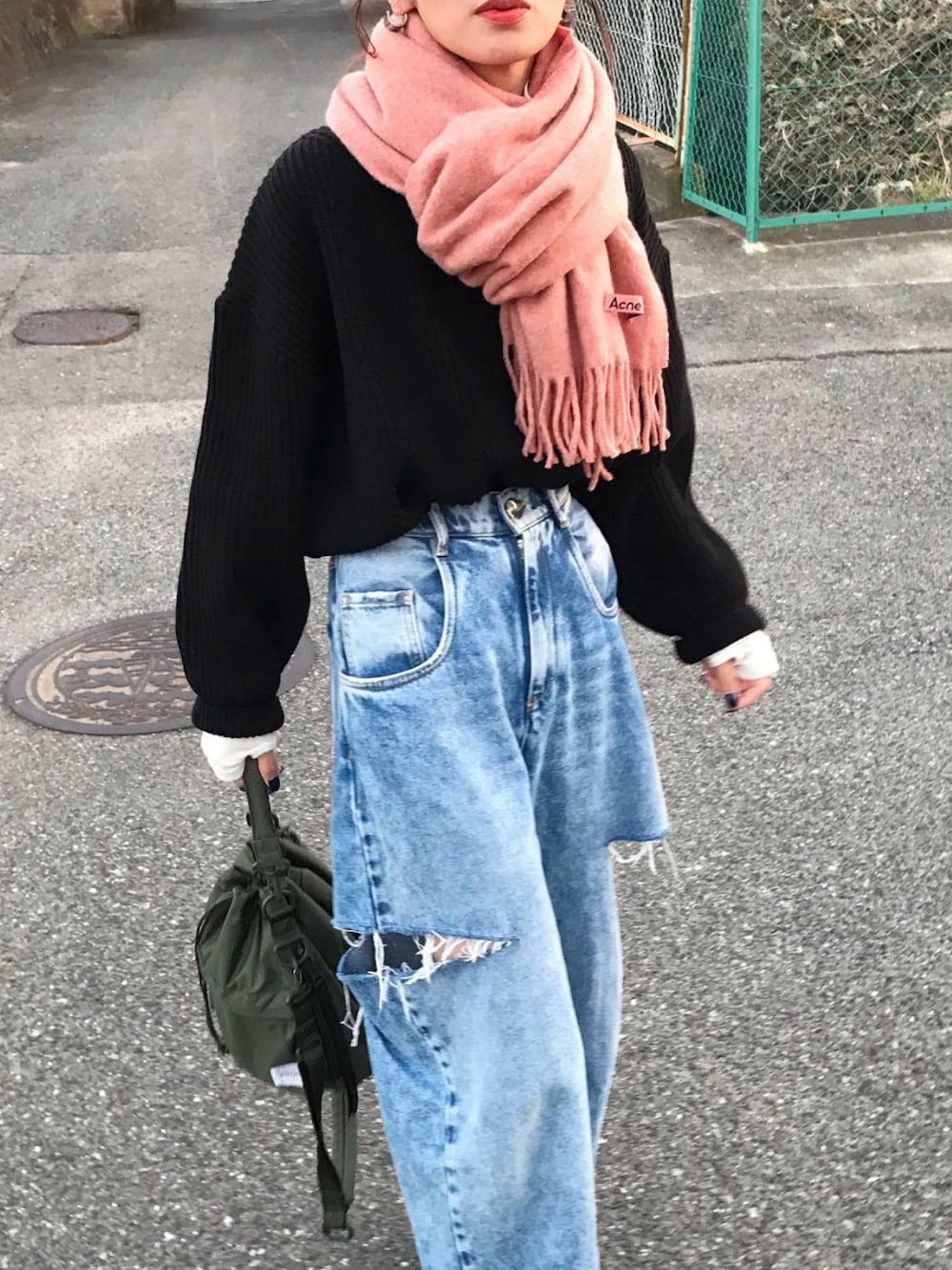 デニムに黒にピンクマフラー🧣 インスタ @kumika_iiio2
