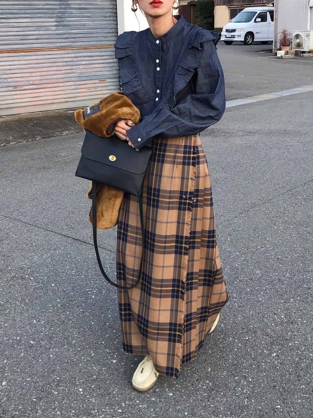 チェックスカートとデニムブラウス🌸 インスタ @kumika_iiio2