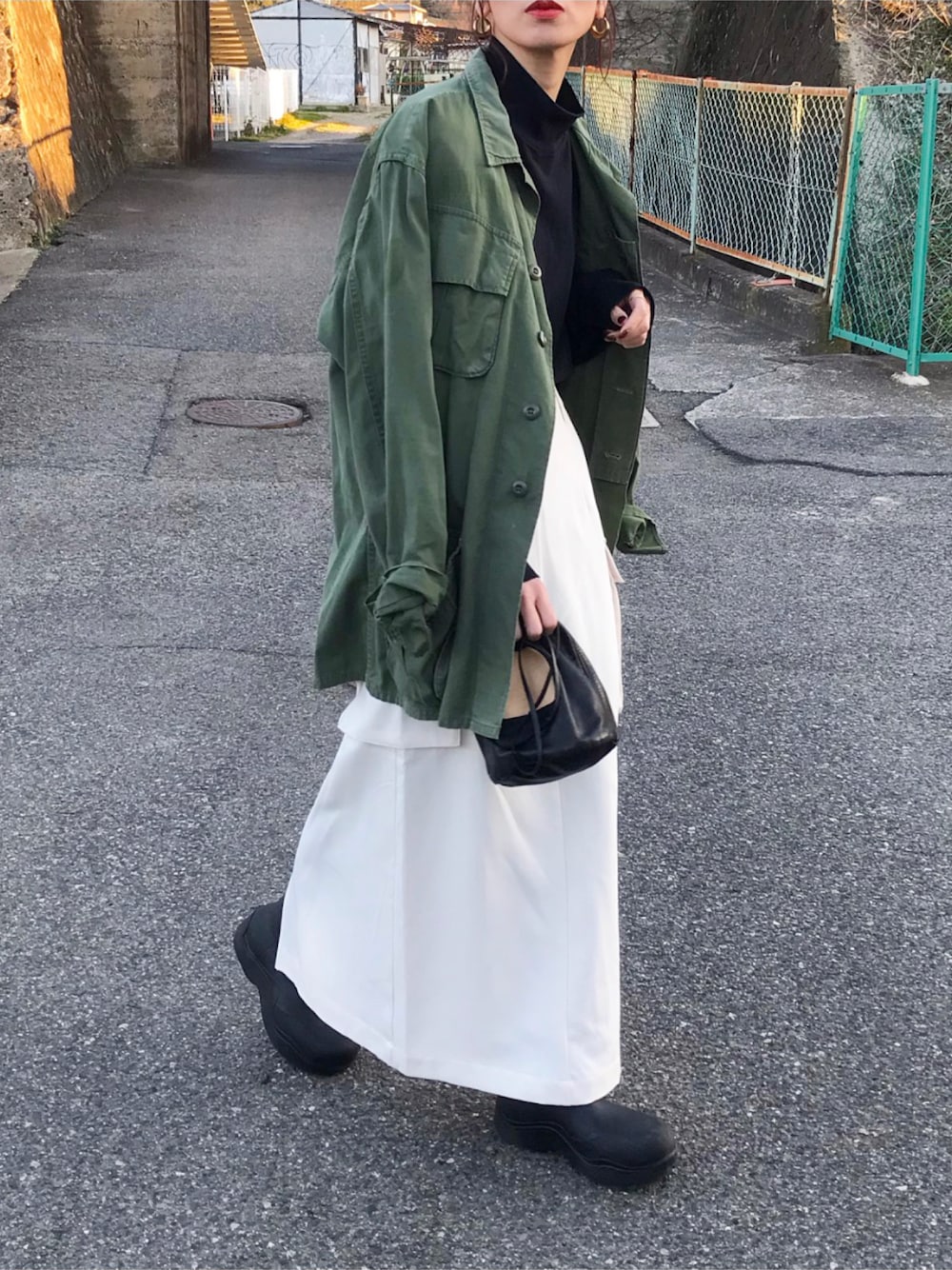 白のカーゴスカートとジャングルファティーグジャケット🌸 インスタ @kumika_iiio2