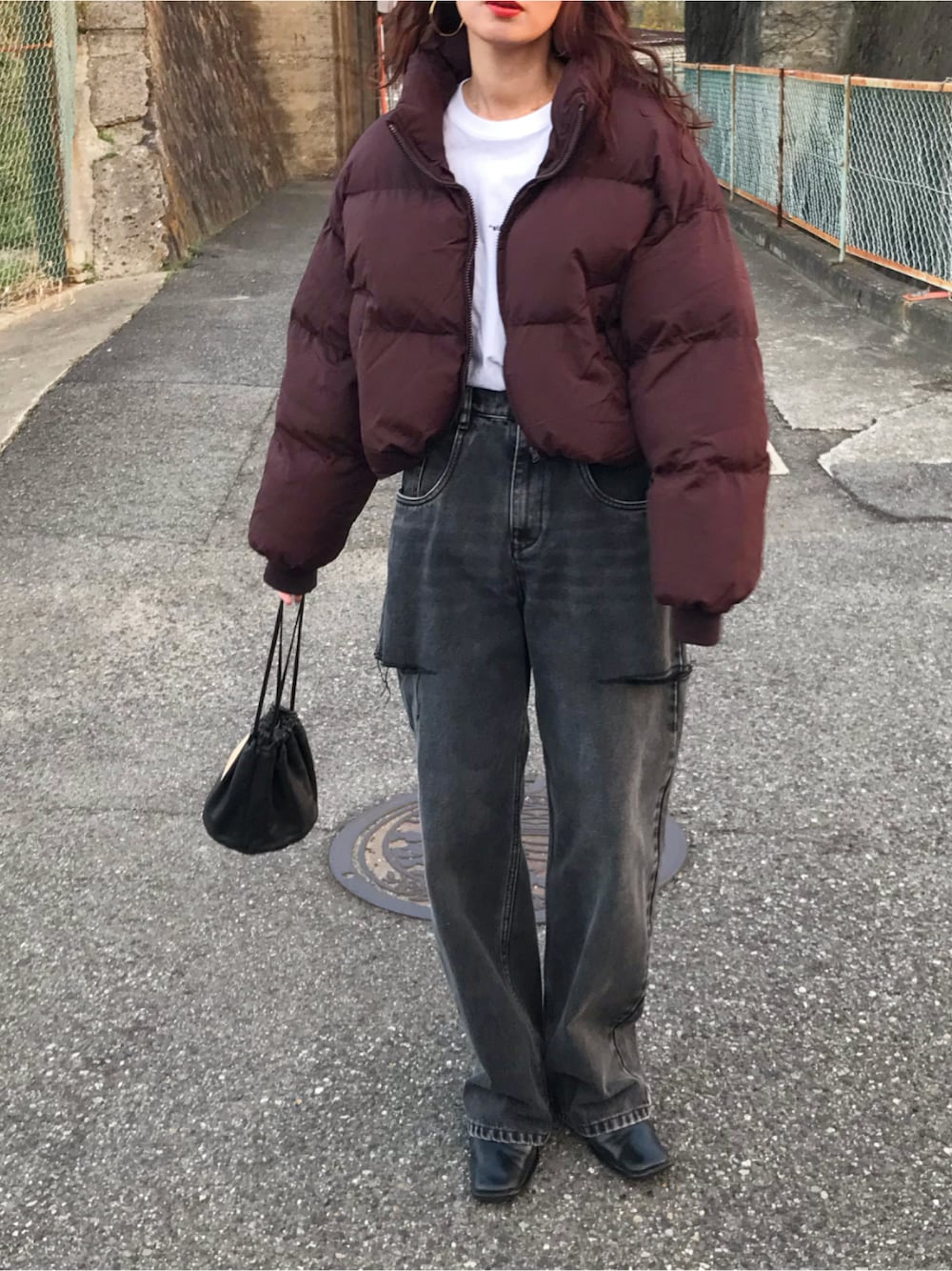 グレーデニムに、ブラウンのクロップドダウン⛄️ インスタ @kumika_iiio2