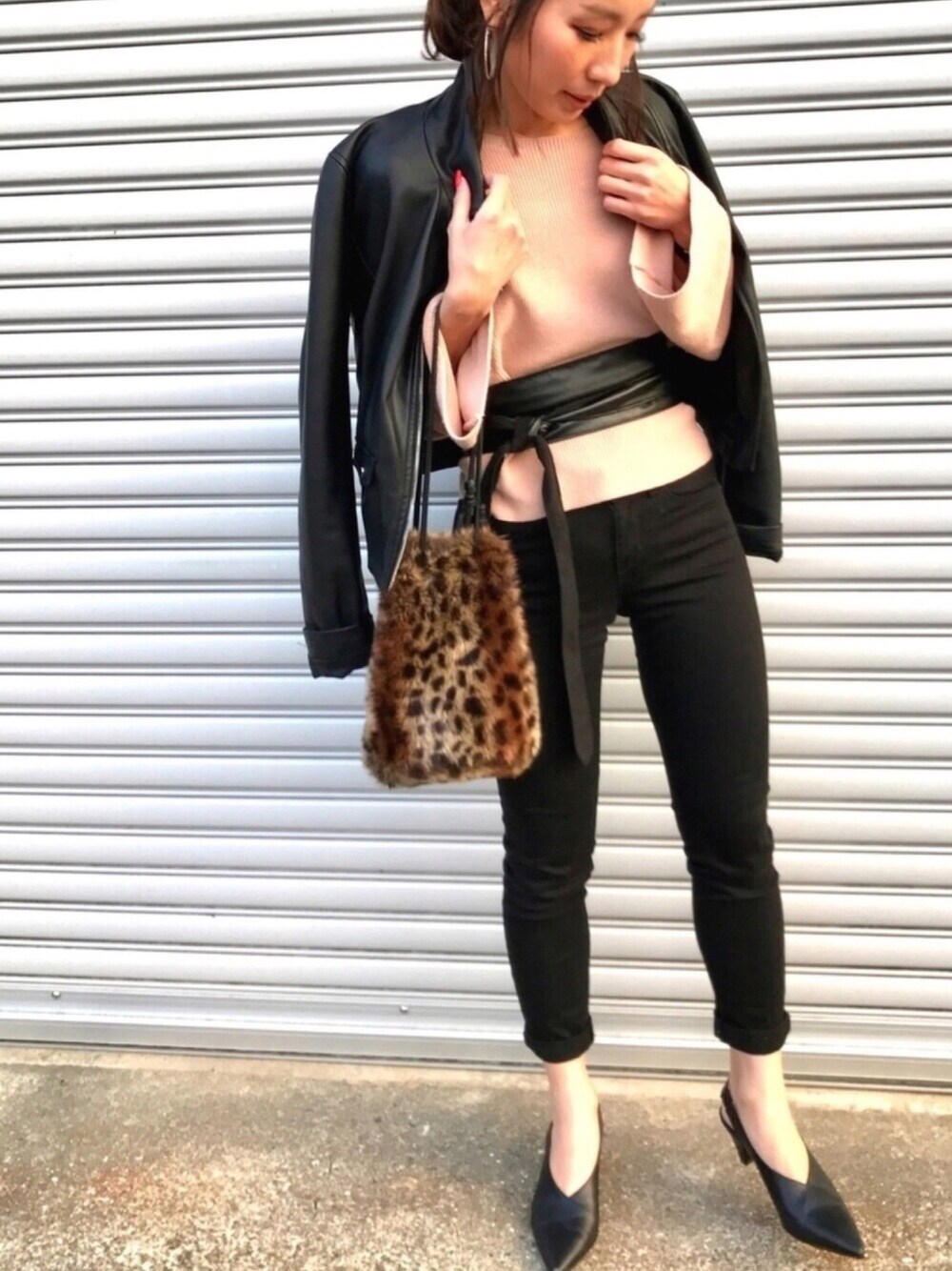 お仕事コーディネート❤️ ブラックコーデにくすみピンクのニット❤️ 何か足りない時は、サッシュベルトでウエストマークします👍💕 ここ最近、花粉がたくさん飛んでるみたいで私は全く花粉症ないんやけど、子供達が鼻ぐずぐずですー😂😂 花粉症ほんま辛そー😭