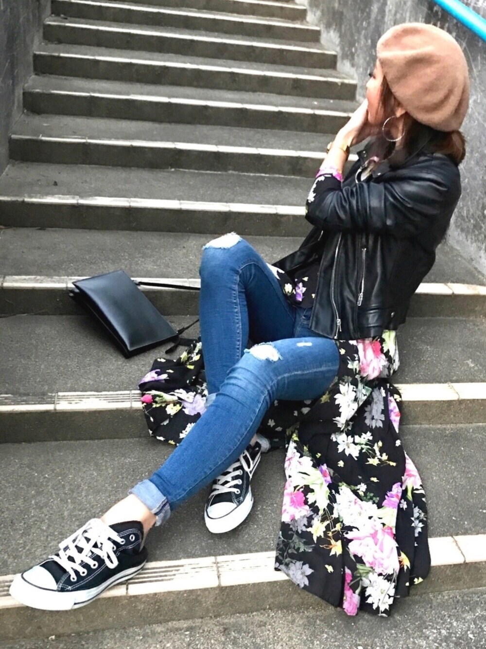 花柄ワンピースにサッシュベルトにライダースジャケット❤️ ワンピの下のボタン開けて、デニムが見えるように😘 スニーカーとベレー帽でカジュアルにコーディネートしました❤️ サッシュベルト写ってなかったから、全身写メは小窓を見てね❤️