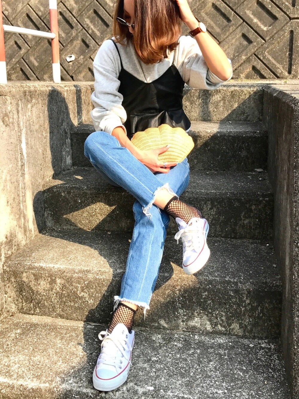 シェルの形のクラッチバッグは、去年から愛用しているもの♡ 実用性は全くないけど、可愛さは抜群!😂❤️ 今日は、薄手のトレーナーにビスチェをレイヤード❤️ これに、レースのビスチェ合わせても可愛かったから悩んだー🤣 足元は網ソックス😜 子供達おったから、スニーカーで🙌💕