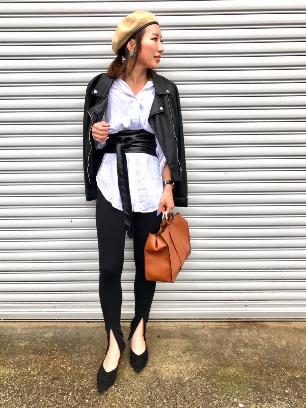 お仕事スタイル💕 スリット入りのレギンスパンツに、シャツワンピースに、サッシュベルト🙌💕 アウターは、ライダースジャケットで😊❤️ ベレー帽は、通勤用👍 帽子被るだけで、仕事着もお出かけ服に変身するので、帽子は常に持ち歩いてます😆💕 パイピングが可愛いベレー帽は、麻混合の素材なので、通気性バツグン👍 これからいっぱい使えそうです😍😍