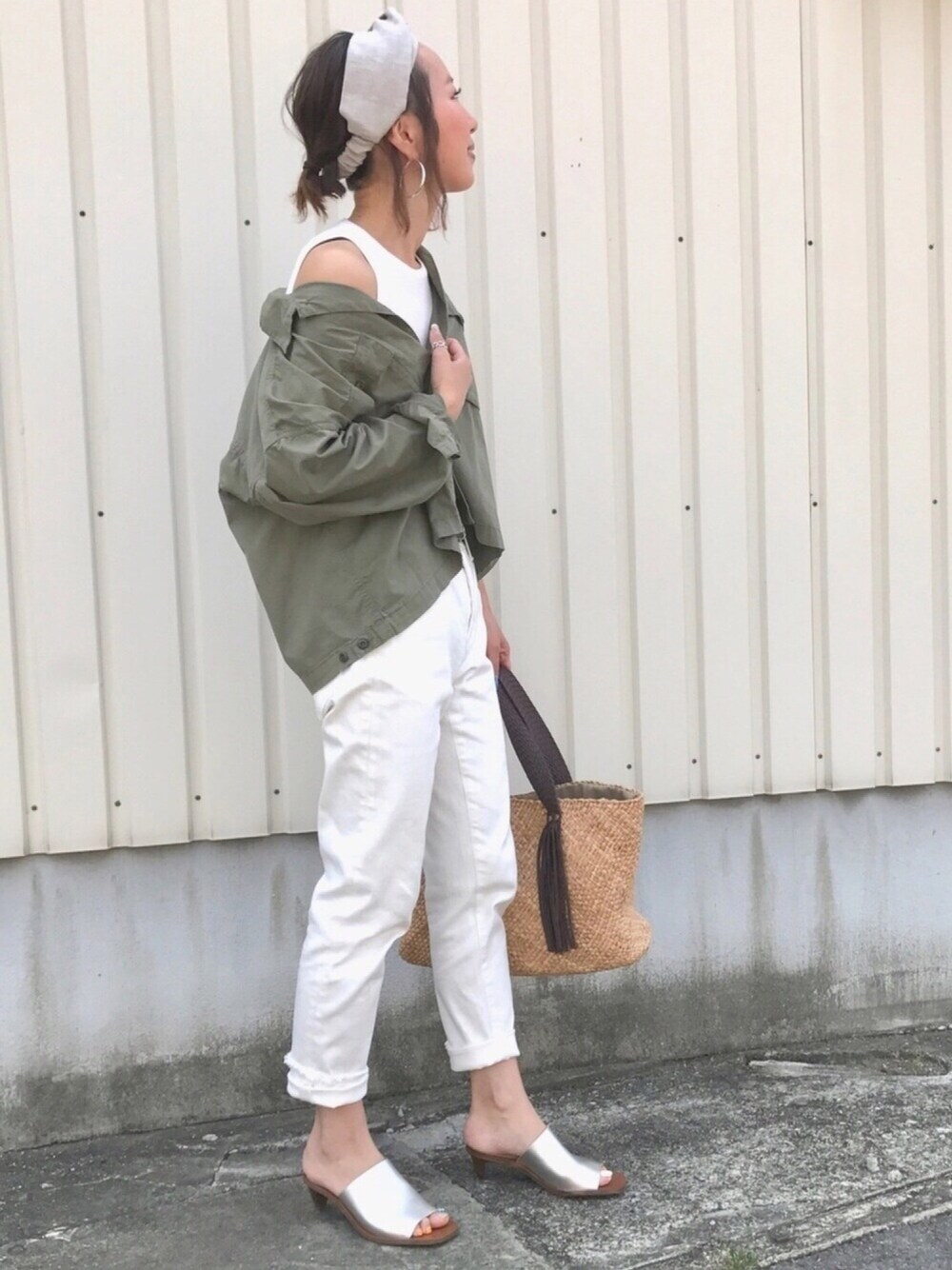 ホワイトにカーキ❤️ 麻素材のヘアバンドとカゴバッグで季節感だしてみました❤️ 今日も暑かったー🌞🌞 このミリタリージャケット、薄くて涼しいから今の時期ちょうどいい❤️ ZARAのシルバーのサンダル、程よいヒールとして光沢で可愛い❤️ フットネイルとよく合います💕