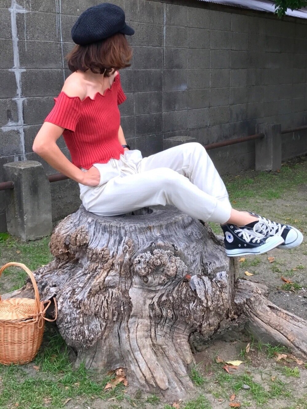 昨日のコーディネート💕😂 久々の色もの❤️ ギザギザのカッティングが可愛いオフショルのトップスは、光加減で赤に見えるけど、テラコッタだよー❤️ ホワイトのスエットパンツと、コンバースと合わせて😊 昨日は子供達から、母の日のサプライズ❤️嬉しかったよー😭😭💕