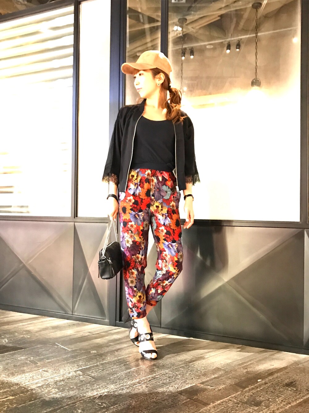 新作コーデ♬ フレアスリーブで女性らしさ満点のブルゾンに 花柄のパンツ合わせでさらに華やかな印象に! パンツが主役なので、小物は控えめに! こちらもキャップで外してスポーティー仕上げ!