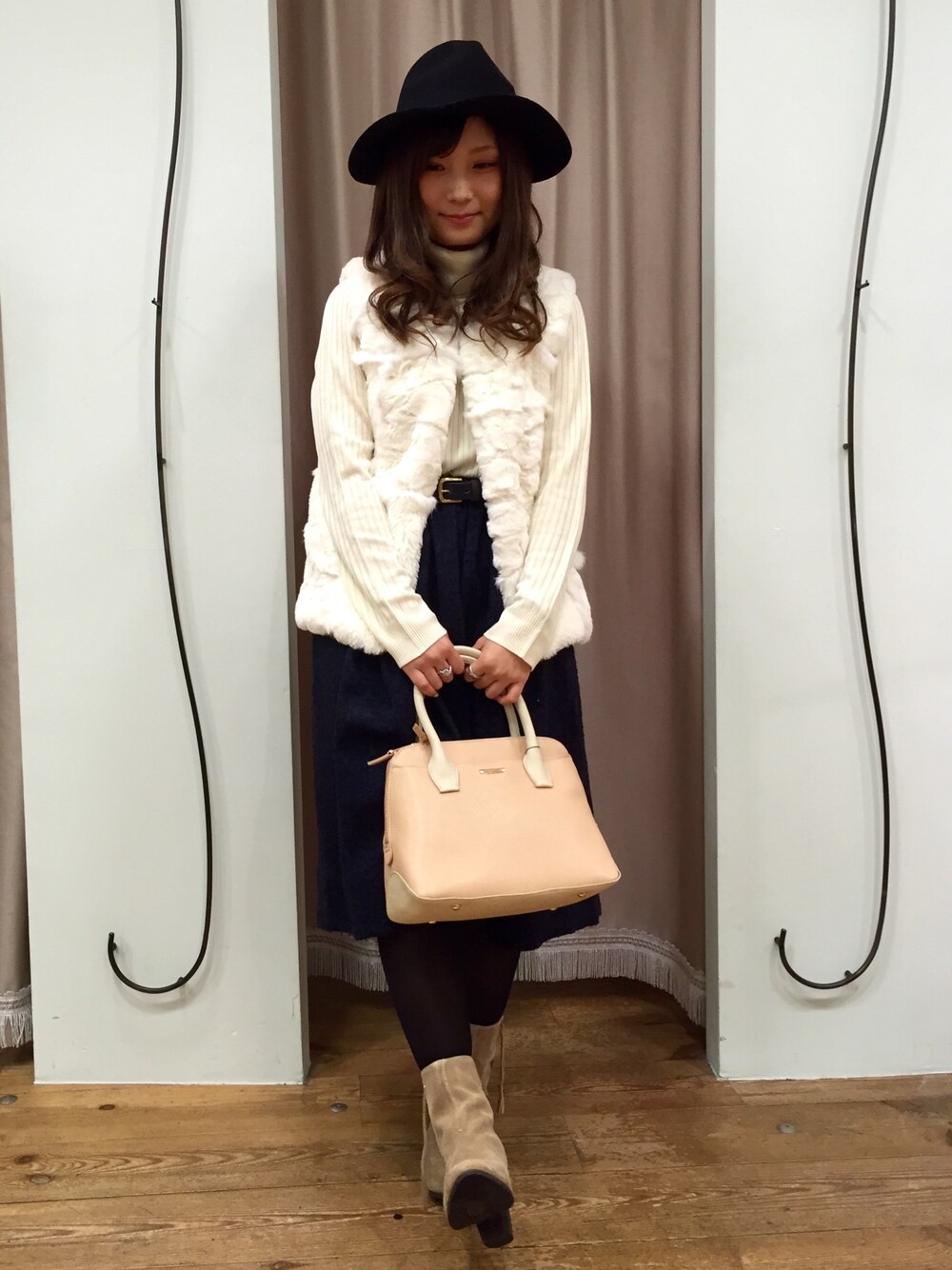 クリスマスらしさをイメージしてみました! 白のタートル×白のファーベストで ふんわりとした女の子コーデです♪