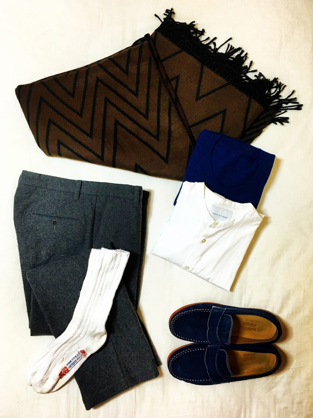 Shirt:バンドカラーシャツ(ADAM ET ROPE') Knit:ウールセーター(ADAM ET ROPE') Pants:ウールスラックス(ADAM ET ROPE') Shoes:スウェードローファー(WANDER SHOES) Other:ポンチョストール(MONKEY TIME)