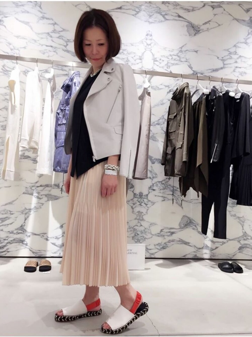 プリーツスカートが甘く見えすぎないように レザーライダースでコーディネート!