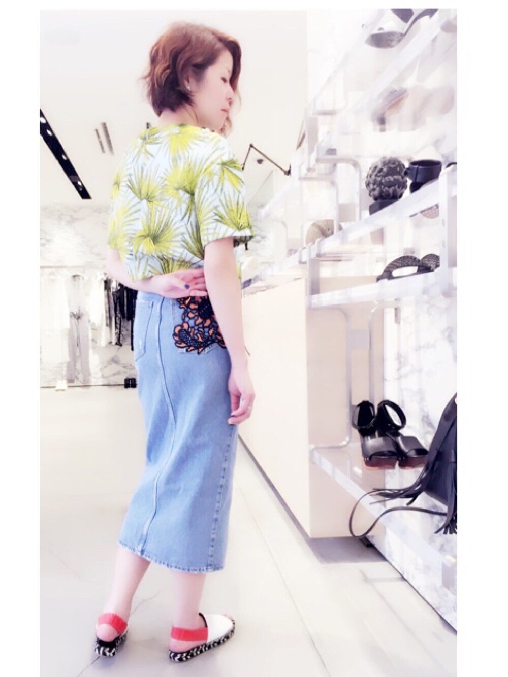 デニムのスカートの刺繍がポイント!夏に向けてカラフルカラーコーディネート。