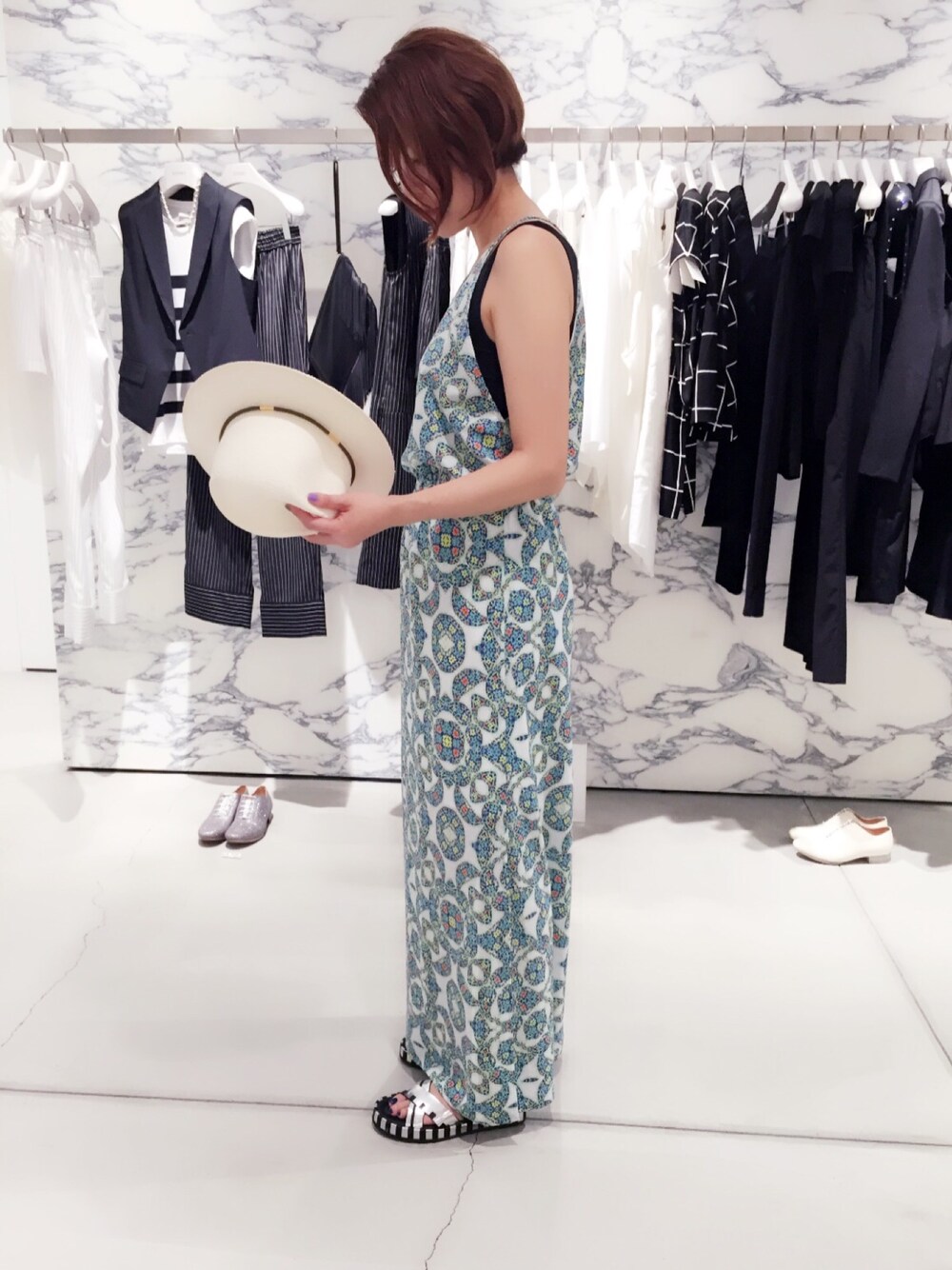 万華鏡柄のマキシワンピースにハットでリゾートコーディネート!
