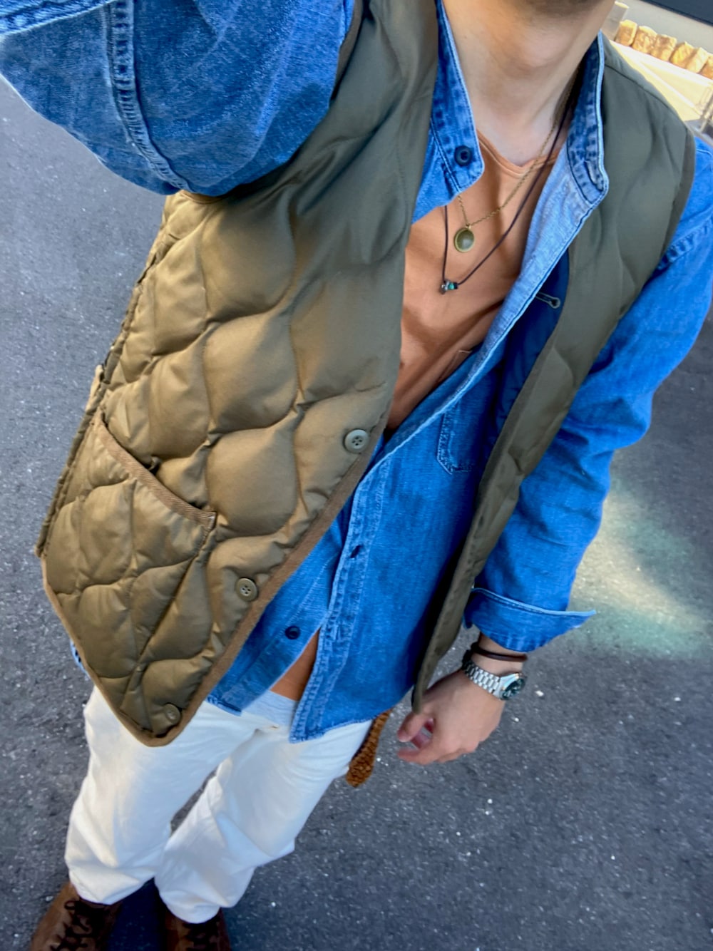 珍味のダウンベスト「TAION MILITARY V NECK BUTTON DOWN VEST (TAION-001BML-1)」を使ったコーディネート