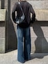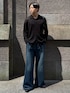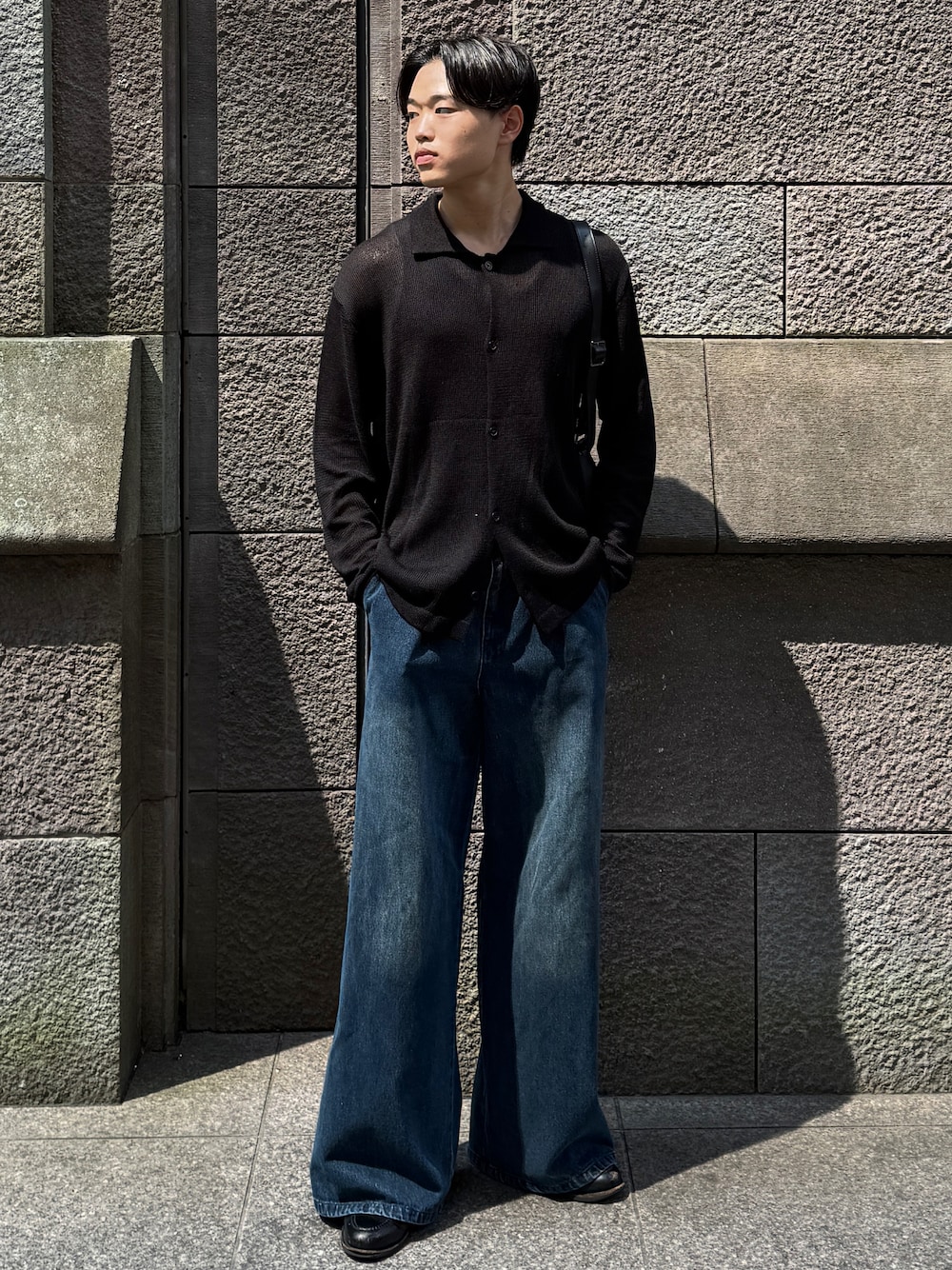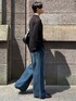 トレンドの襟付きで、透け感があるからこなれ感を演出できるよ! トップスはタイトでパンツはワイドスタイルがオススメ💡 王道のブラックとブルーの色合わせオススメだよ!