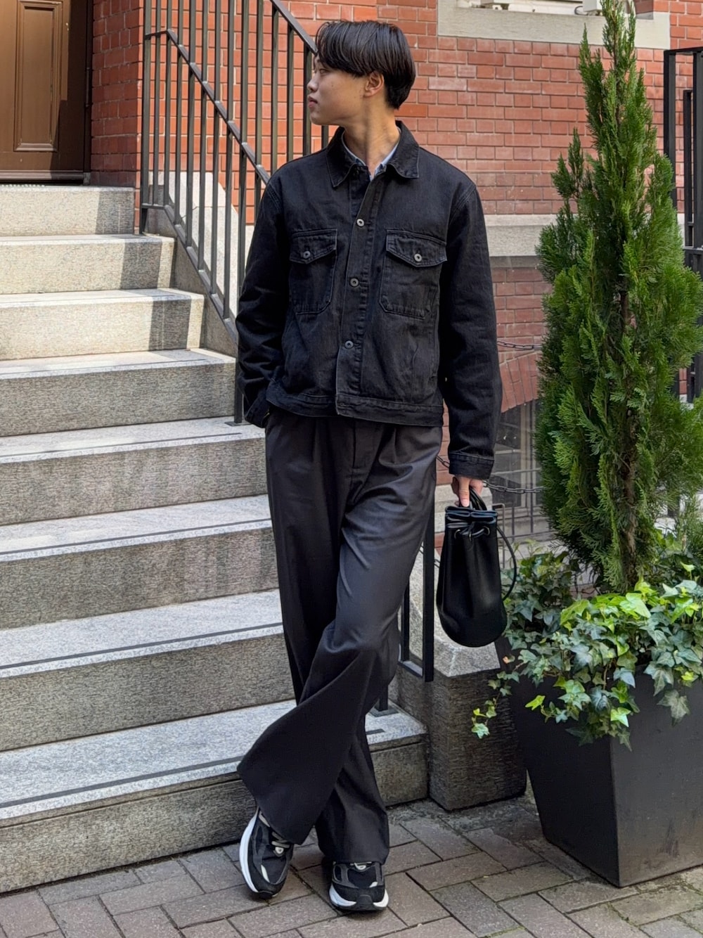 デニムジャケットはカジュアルなアイテムだから、キレイめなシャツとレイヤードするのがオススメ! パンツはスラックスに変えると、全体のバランスが取れてオシャレに見える💡