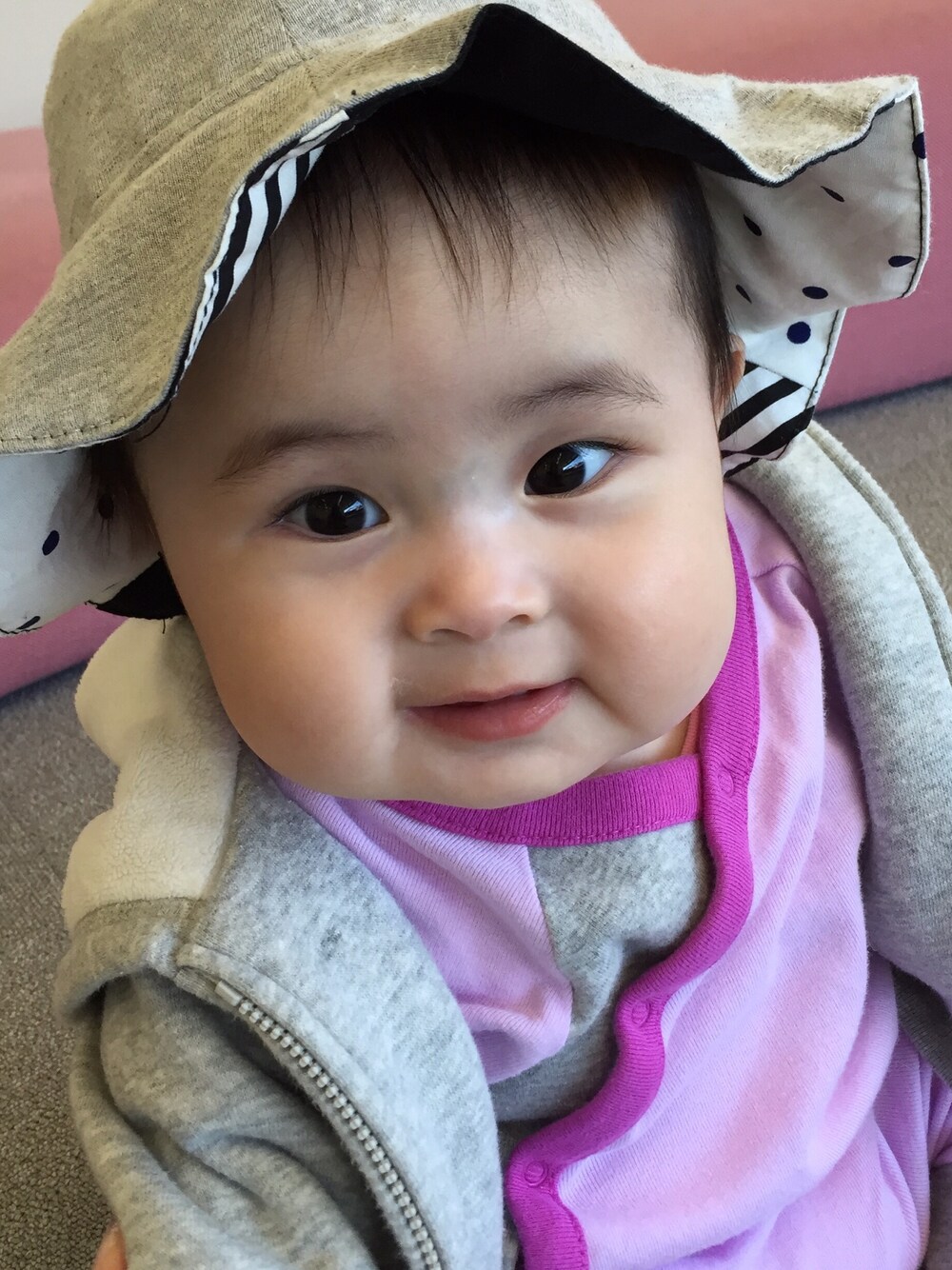 紫外線対策に帽子購入しました リバーシブルで可愛い♡ ベビーカーで図書館に来たよ😆