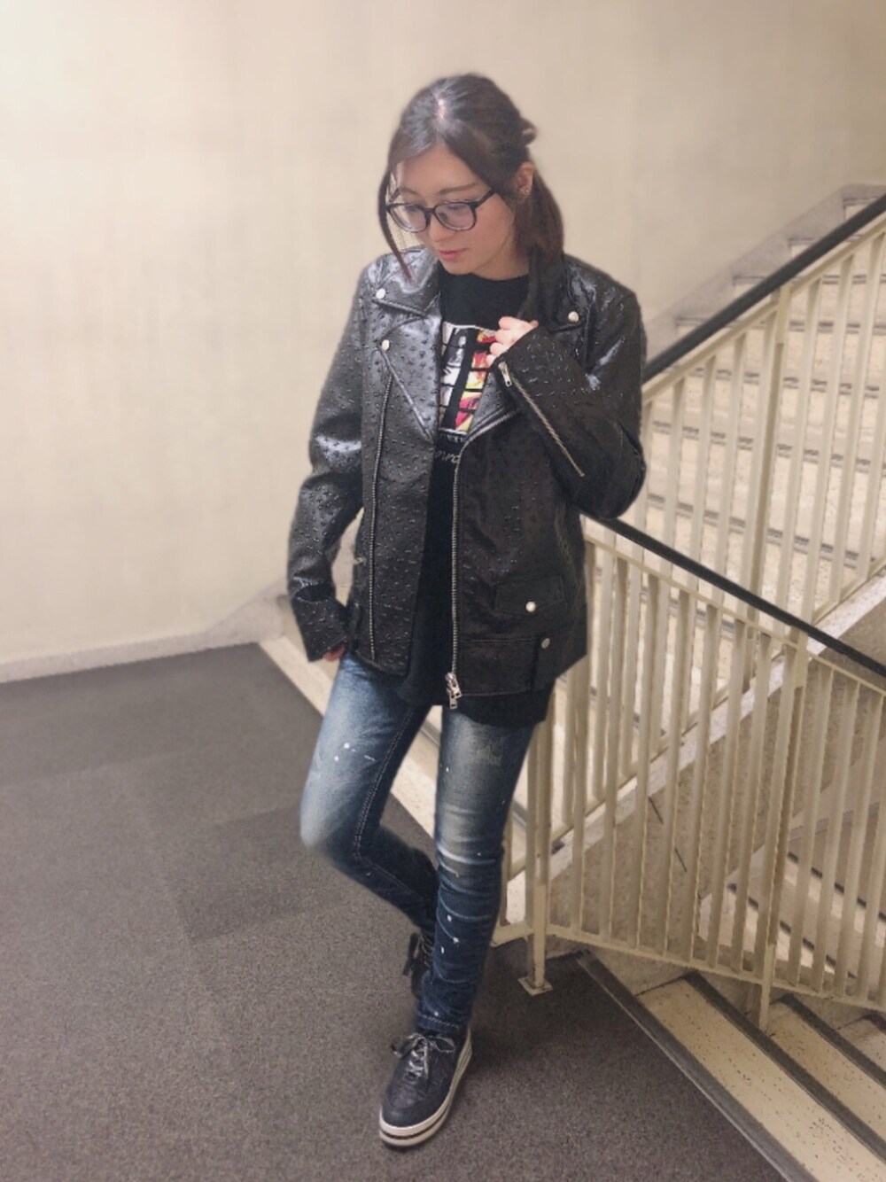 スターエンボスダブルライダースgirls photo Tシャツ👕とパワーストレッチスーパースキニー👖 珍しくライダース女子です🏍 最近周りがバイク乗り多くて乗りたいけど怖くて乗れない系女子です笑笑 珍しく髪の毛も縛っております😏😏