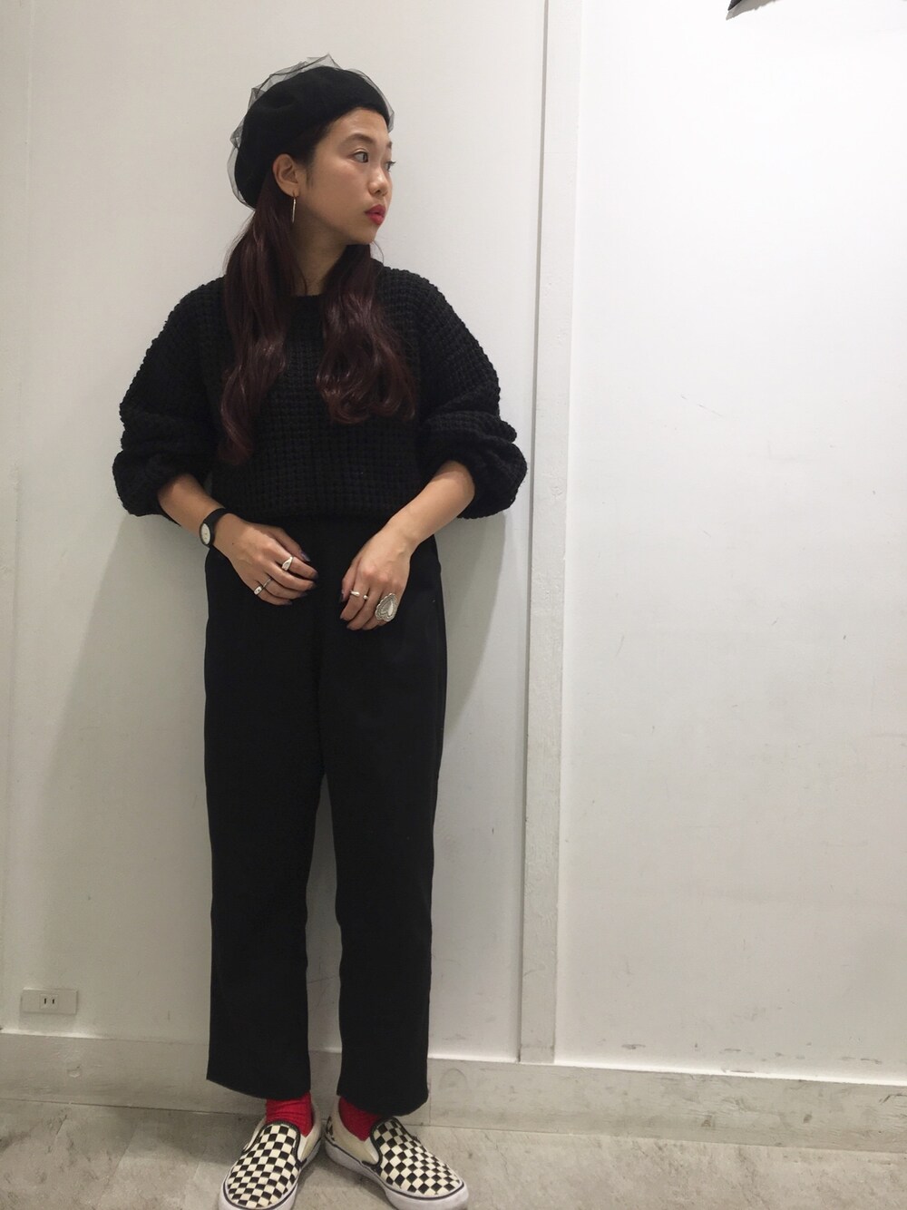 プチプラブラックコーデ◎ 全身色を揃える時は、靴下や靴にポイントカラーを入れてアクセントをつけます😋✊