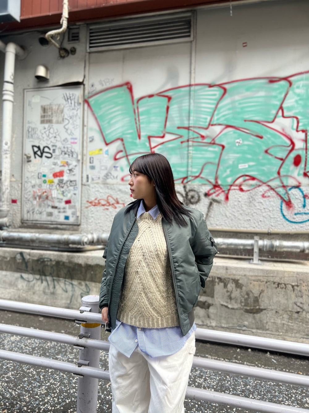 asuka(AVIREX 相鉄ジョイナス店)のニット/セーター「FOIL PRINT KNIT TOPS/箔プリントニットトップス」を使ったコーディネート