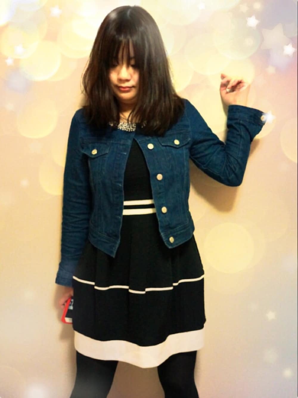 襟のビジューが可愛いデニムのノーカラージャケットと黒のバイカラーのワンピ。 ワンピのスカートの形がコクーンぽくなってるのです。