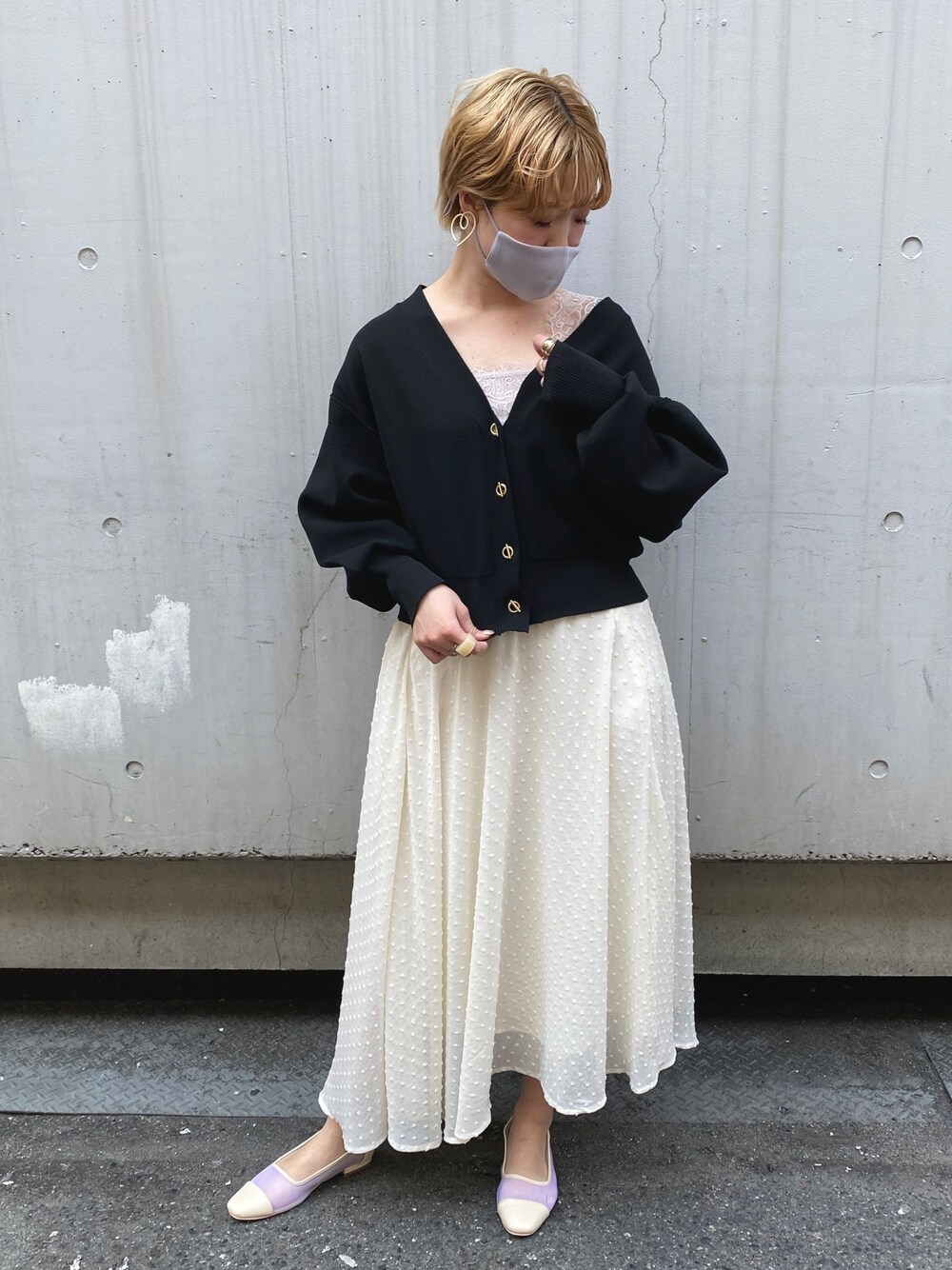カーデはセットアップアイテム!🍦💕 (同じ素材のニットスカート有り! タグ付けてます!) 着回し編としてup致します❤︎ シアーなドットスカートは、アシンメトリーな デザインで揺れ動くたびにきれいになびき、可愛いです🤍 足元もシアーを取り入れて黒のカーデを より、春っぽく見えるよう合わせてみました❤︎