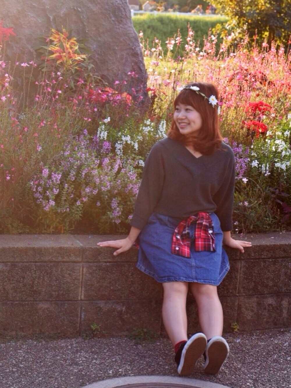 一目惚れして買ったJEANASISのニット♡ グリーンに近いグレーで大人っぽい色合いがお気に入りです(*^^*) スカート:mystic チェックシャツ:HERE'S スニーカー:COACH