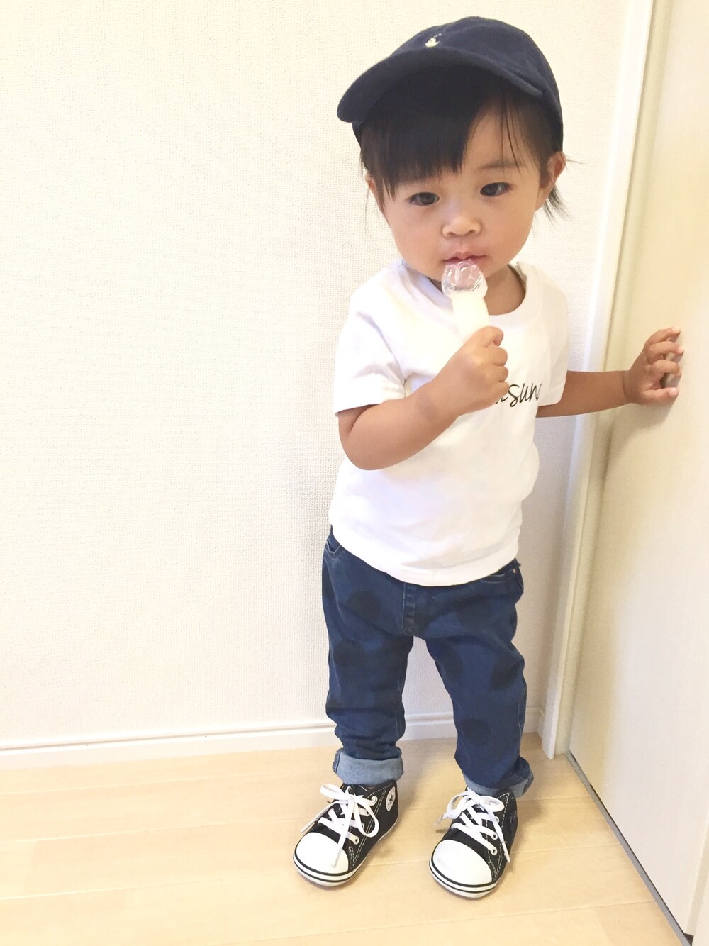 絶賛チューペットにハマり中の1歳3ヶ月娘😂💦 昨日の買い物で一目ぼれのZARAのデニム‼️よーく見ると👀、ドット柄が薄く入ってるの😍これ系大好物なやーつ😏❤️お値段も金欠の私には最高なやつ😚❤️早速履かせて見ました🤗ボーイズ系でシンプルコーデ😊Tシャツは仲良し友達が同級生BABYみんなでお揃いでくれたやつ😊❤️名前入り😍❤️ いいねやセーブ、コメント、フォローなんてしていただけたらとっても嬉しいです🤗仲良くしてください😚