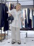 ご覧いただきありがとうございます😭 【 155cm / 骨格ストレート 】 甘めなフリルブラウスを スウェットパンツでカジュアル合わせ! お腹周りも隠れるので安心感も抜群🌟