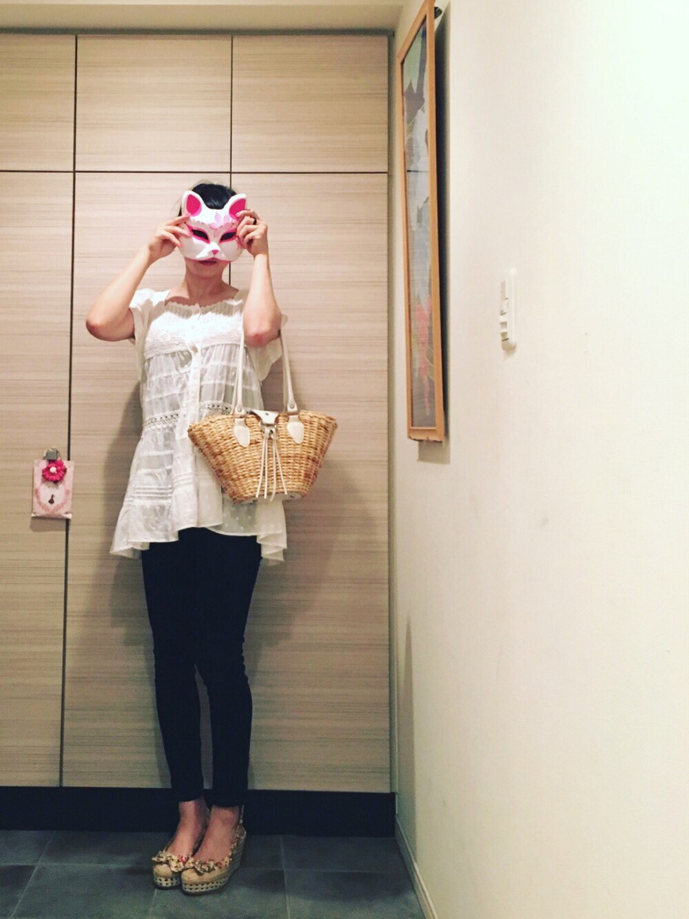 夏がテーマです。 白のブラウスは大好きで何枚も集めてしまう。 サンダルも鞄もカゴ素材で夏の印象。