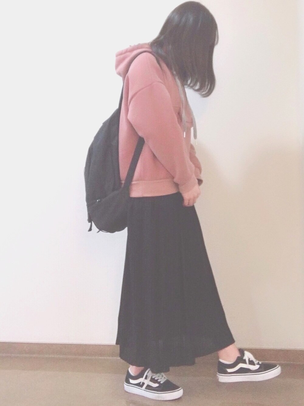 トップスは韓国通販で買いました! 前にカンガルーのような大きなポケットが付いていてとっても可愛いです😍 すぐに携帯を失くす私は、そのポケットに入れています🤭 スニーカーは勉強頑張ったご褒美に買っていただきました👟 リュックはLeeのムック本のものです!