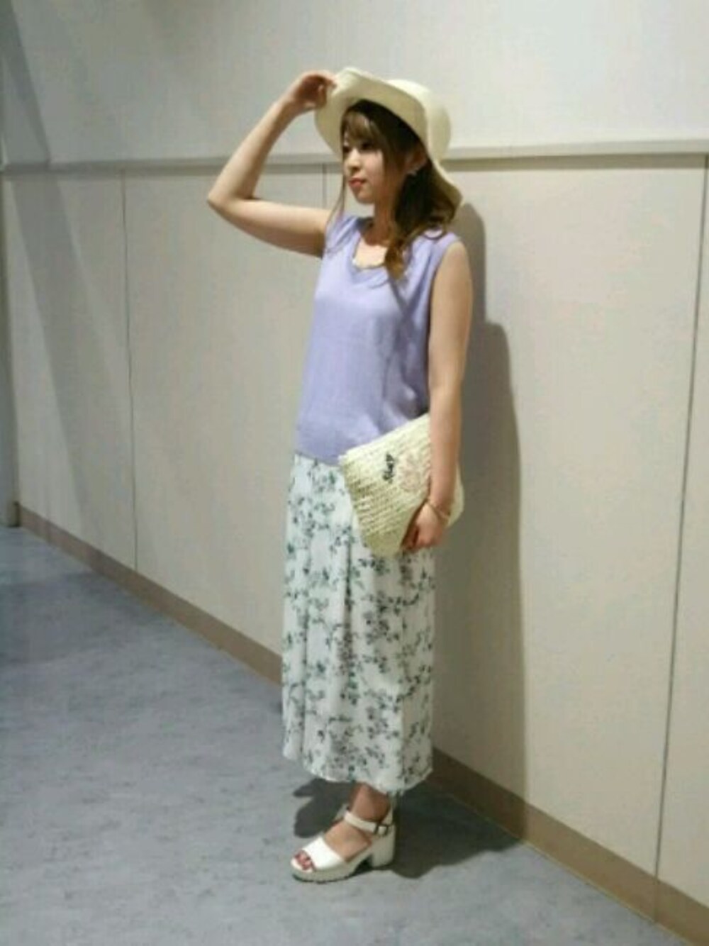 花柄のスカンツに、淡い色のパープルのノースリで合わせてみました(*^^*)! 優しい色の組み合わせで可愛らしく(●^o^●)! ベストとしても着ていただけるので着回しも抜群ですよ~(>_<)!