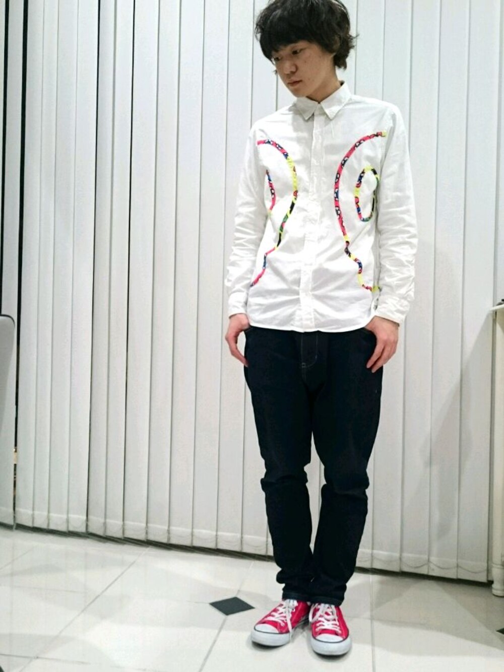 今日のコーデは、靴以外ツモリチサト!(o⌒∇⌒o) 真っ赤のコンバースを差し色に使いました!